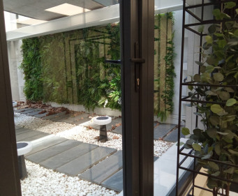 Detalles de paredes, jardín en patio interior, despachos con una cuidada línea y con detalles de revestimientos decoractivos, plantas y maceteros.